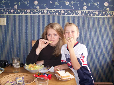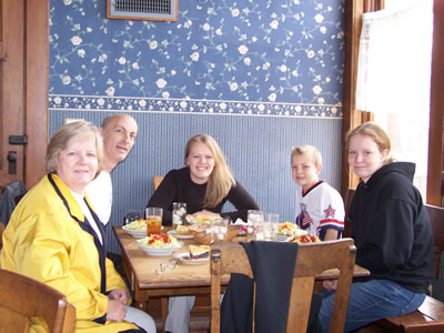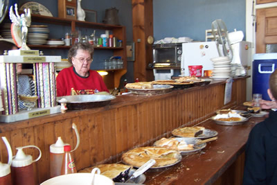 Each day of the week is assigned a specific meal. Since we’ve only ever dined there on Fridays, we are always privileged to partake of the Taco Salad (Joey prefers the always-available turkey sandwich). A multitude of pies are baked daily by Frannie (wearing the red sweatshirt), and large pieces of each one may be purchased for an additional dollar.