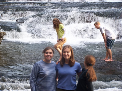 A few brave souls – Sarah, Rebekah and Libby, with Gretchen and Dustin in the background – endure the sting of the cold mountain water to enjoy a few moments of wading.