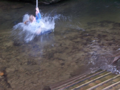 Apparently an odd occurrence of nature caused the water to rise rapidly, thus reducing the clearance between the swing and the surface of the water…and resulting in this chilly…uh, swim. :-) (I’m not sure whether to thank Caleb for capturing this succession of events on my camera for me or not…)