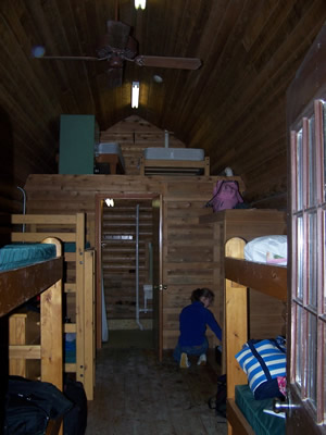 The cozy interior of our little log home for the week.